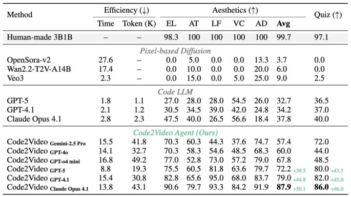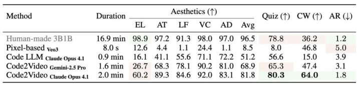 表 1: Code2Video 与各类方法对比结果