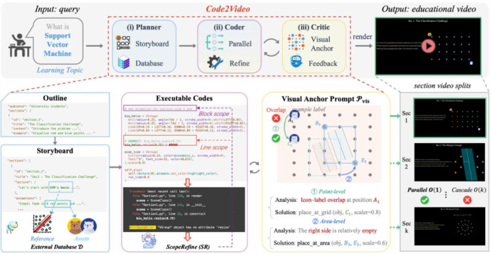 鉴赏家(Critic)——利用多模态模型(VLM)反馈与视觉锚点提示(Visual Anchor Prompt)对生成的教学视频进行修正,避免元素遮挡、位置错乱,保证画面层次清晰、讲解可读。