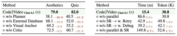 本文进一步对 Code2Video 的关键组件进行了消融分析,以考察各模块对视频质量与生成效率的贡献。