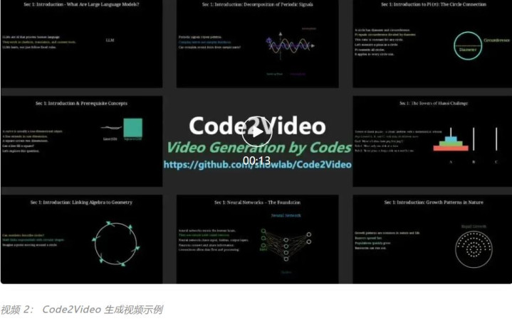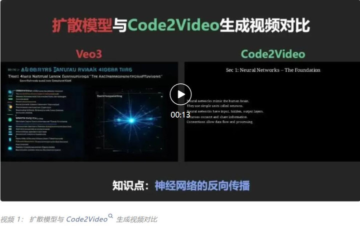 Code2Video 将复杂的知识点转化为逻辑清晰、视觉精美、可扩展的教学视频,兼顾了视频质量与生成效率。