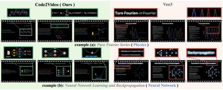 随着视频生成模型的发展,基于像素空间(Pixel-based)的文生视频方法(如 Sora2、Veo3 等扩散模型)在自然场景生成上表现出色,但在教育场景中仍存在以下不足: