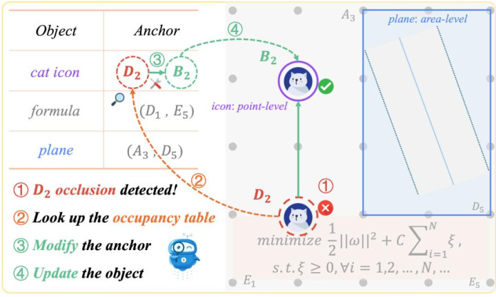 为解决自动生成中常见的元素遮挡、位置错乱等空间布局问题,文本提出视觉锚点提示(Visual Anchor Prompt),为关键视觉元素(如公式、图表、文本框)在画面中的相对位置和层次提供了结构化的指导。在生成代码时,自动维护锚点提示表,记录放置对象以及对应锚点坐标;在检查到视频中布局不当时,Critic 会查表并生成具体的新锚点、以及可执行的反馈(如 move to B2)给 Coder 进行迭代修正。